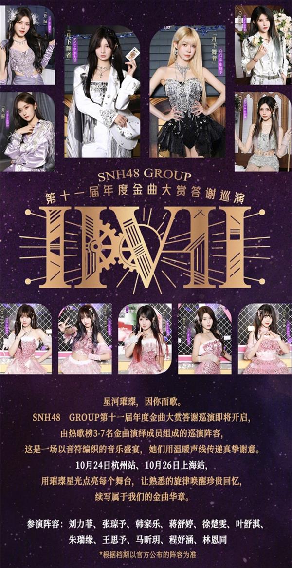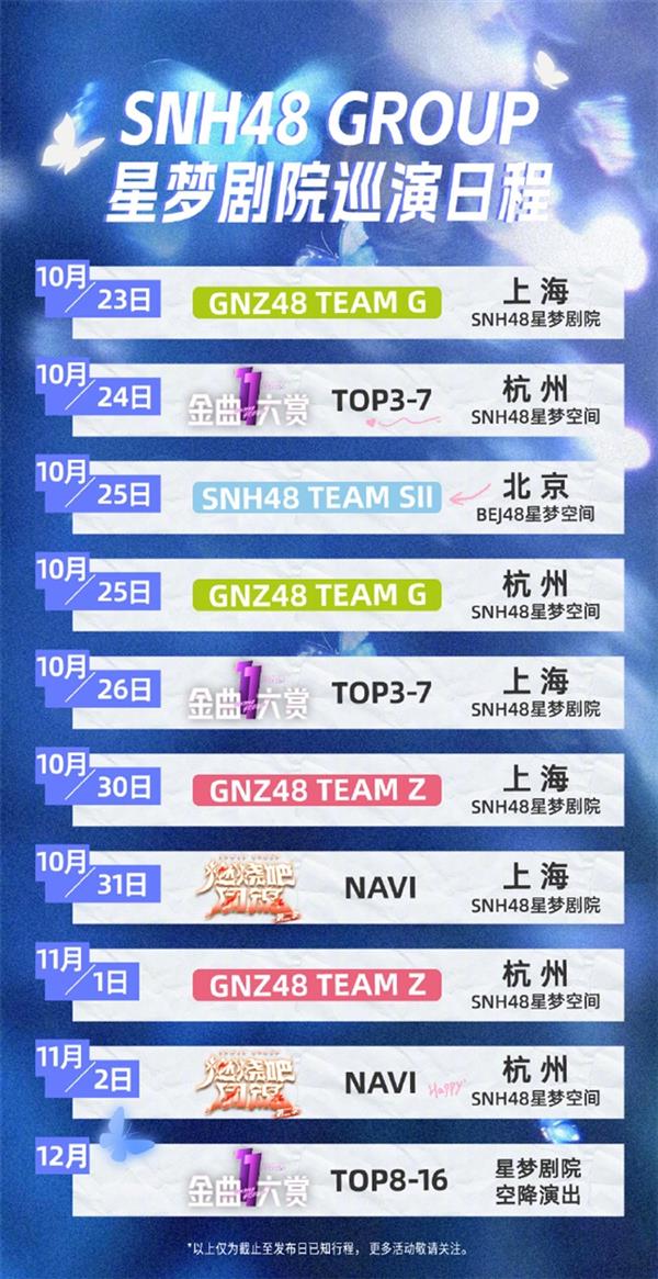 10 月至 12 月,星梦剧院巡演覆盖上海、杭州、北京等多个城市,既有 SNH48 星梦剧院的常规公演,也有 BEJ48 星梦空间、SNH48 星梦空间的特色演出,更将 “第十一届年度金曲大赏”“燃烧吧团魂第二季” 等 IP 活动与巡演结合,例如 GNZ48 TEAM G、TEAM Z 将带着 “金曲六赏” 主题登陆舞台,让巡演不再是单一的歌曲表演,而是融入了经典 IP 的主题化呈现。