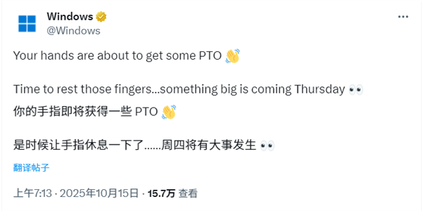 微软Windows官方账号今天发布了一条神秘的预告:“你的双手即将获得一些PTO(带薪休假)。是时候让手指休息一下了……周四将有大事发生。”不过微软并未透露更多线索。