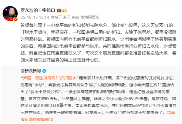 他表示:希望每年双十一电商平台的折扣都能去除水分,简化参与流程。