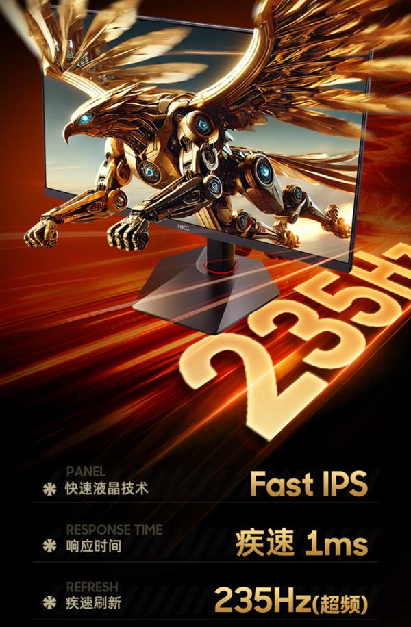 在电竞显示器的核心性能指标上,战舰S7同样表现出色。其搭载了235Hz超高刷新率,这意味着在高速移动的画面中,每一帧都能得到更流畅的展现,有效减少画面撕裂和拖影现象,为玩家提供更精准的操作反馈。配合1ms的GTG灰阶响应时间和HKC自研的DIC动态模糊消除技术,能够有效减少动态画面中的模糊感,无论是FPS射击游戏中的快速瞄准,还是MOBA类游戏中的技能释放,都能做到“指哪打哪”,大幅提升竞技表现。