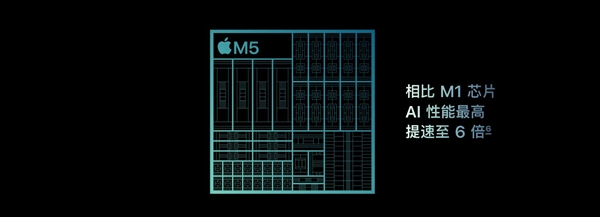 据悉,苹果M5芯片基于3nm工艺制程制造,这颗芯片的每个图形处理器核心均内置神经网络加速器,从基于扩散模型生成图像到大语言模型(LLM)词元生成,各类AI任务的处理速度都大幅跃升。相比M1芯片,M5芯片的AI性能最高提速至6倍。
