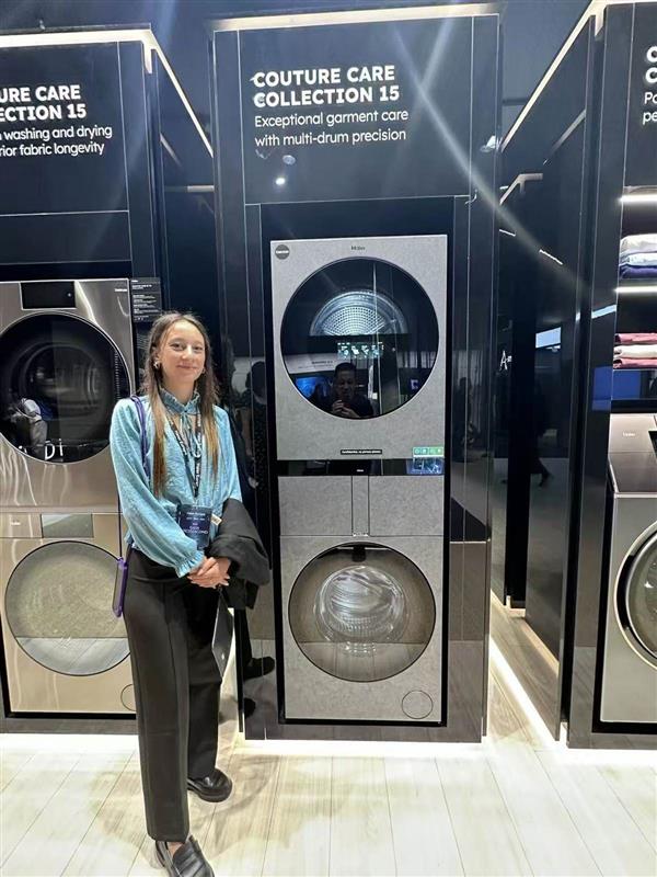 最后是便捷操作需求。多筒叠加虽然简单实现了分区洗,却也使操作更加繁琐而费时费力。针对多水路延长等待时间,融合·洗护家原创网格式一体水电系统,将16水路高效整合,实现9进7出分支进出有序,是唯一直接适配家用水电的四筒洗衣机;针对多系统操作繁琐,AI智慧交互系统升级操作体验,一屏智控四筒,无需分屏频繁操作,配合AI人感交互,在30cm范围内靠近,2秒即可开机,挥手开下筒、敲击启上筒,智能语音一呼百应,彻底解放双手;针对不同身高操作不便的问题,设计1400mm黄金高度让用户平视即可操控,还以1.6米用户为参照设计干衣机取衣口高度,将人体工学理念深度融入洗衣机设计。