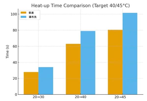 热水器的第一项关键测试,是升温速率。它决定了从拧开水龙头到热水真正流出,要等多久。这个时间看似只是几秒钟,却直接影响使用体验:时间越长,就要浪费更多冷水,也意味着我们得多「罚站」几秒。实测发现,万和安睡洗 V9S TURBO 的升温速度普遍较快,基本能在半分钟左右达到设定温度。答主 @Cecilia 在室温 20~24℃、自来水常温约 20℃ 的环境下,用直插式电子温度计和秒表进行记录。她设定了 20→30℃、30→40℃ 两个区间,结果显示普通模式下前者约需 28 秒、后者约 35 秒;瀑布洗模式下前者约 34 秒、后者约 45 秒。