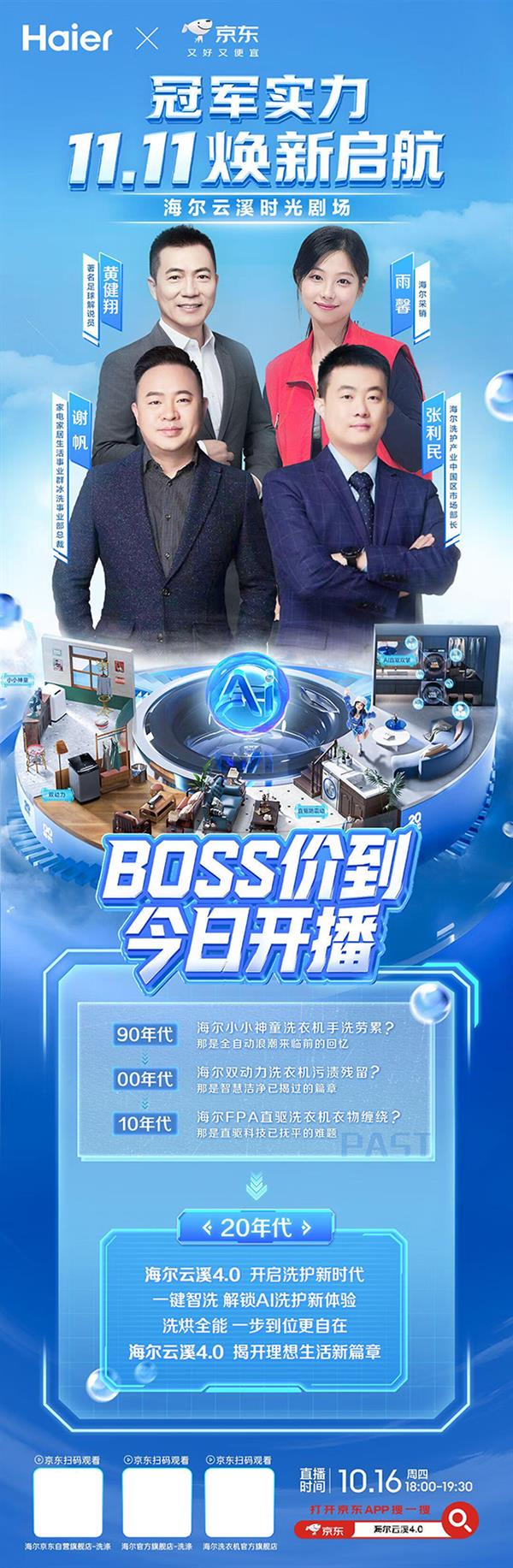 今年11.11大促刚启幕,一众家电家居知名品牌总裁便空降京东直播间,为消费者送上惊喜福利。10月16日晚18点,海尔洗护产业中国区市场部长张利民将做客京东家电家居采销直播间,携手京东家电家居事业群冰洗事业部负责人和著名足球解说员黄健翔共同带来一场“时空穿越”式的科技大秀。双方将带领消费者回顾洗衣技术从“洗净”“护衣”到“静音”的演进历程,并在“未来实验室”环节首度揭秘海尔云溪4.0的AI黑科技——如何用一套系统解决传统洗护的“洗不净、伤衣物、噪声大”三大痛点,重新定义智慧洗护。