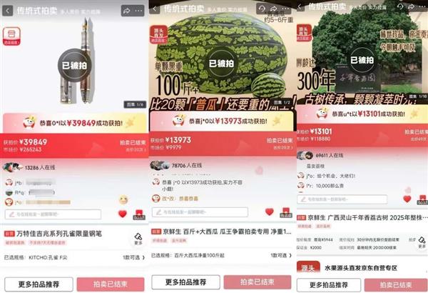 美食惊喜日上,京东采销遍寻全国各大西瓜产地,挖掘出北京庞各庄的“百斤西瓜王”登上“京东拍卖”频道,吸引了超10万用户的围观,直接拉动西瓜销量环比大涨100%、同比大涨超200%,最终以13973元成交。发烧友惊喜日上,京东采销挖掘到了全球限量8支、市价超26万元的典藏级“万特佳孔雀钢笔”,最终被一位沈阳名笔收藏发烧友以3.9万元拍下,狂省22万。这一天,超3000万发烧友爱好者涌入京东,“京东拍卖”频道围观人数环比增长超6倍。