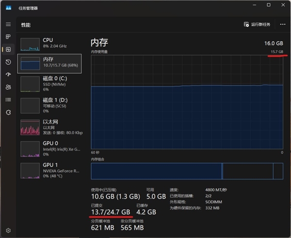 在已提交一栏有两个数字,其中第二个就是物理内存+虚拟内存的和。从我自己的电脑(截图)能够看到,我电脑的物理内存为16GB(可用15.7GB),而已提交内存总和来到了24.7GB,这也就意味着我的虚拟内存高达9GB。对于16GB物理内存来说,9GB的虚拟内存绝对不小,显然我的物理内存是不太够用的。