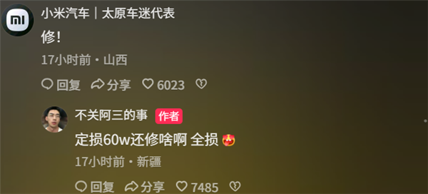 在评论中,该车主透露,车辆定损60万,已经走了全损。