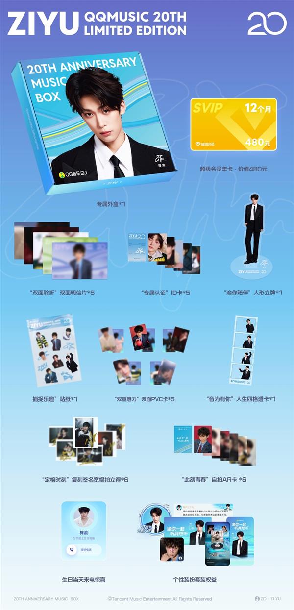 为了回馈用户20年来的支持,QQ音乐推出20周年青春大使「梓渝」·限定礼盒,用户购买后不仅可直接获得QQ音乐SVIP年卡权益,畅享无损音质等权益。礼盒内还包含梓渝未公开独家自拍AR卡、复刻签名宽幅拍立得、人生四格透卡、人形立牌等特别好礼,更有生日来电、个性装扮等超多福利,等待粉丝们解锁。
