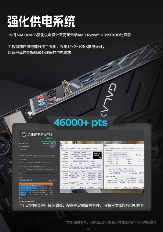 实验室数据,搭配锐龙旗舰R9 9950X3D运行CINEBENCH R23测试时,主板供电表现稳定,助力平台跑出46000+pts的高分。(注:跑分因 CPU 体质、散热条件存在差异)