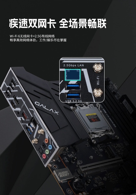 网卡上,影驰联盟 B650M Wi-Fi 黑武士 PLUS 搭载了2.5G+WiFi6的双网卡,兼顾多场景使用,无论居家游戏、办公传输,网络体验都能 “拉满”。