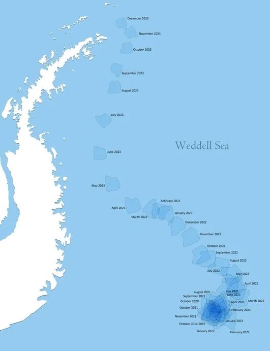 此后, A23 经历过一次破裂,而 A23a 则是其破裂后、飘在海上的一块大冰山。历史上曾经出现过比 A23a 更大的冰山,比如面积超过 1 万平方公里的 B15,以及面积超过 5000 平方公里的 A68a ,但目前依然在海上飘着的冰山中,A23a 是最大的。