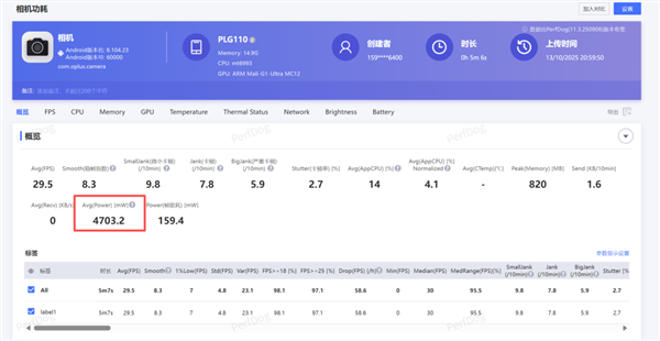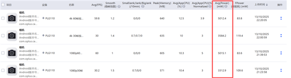 录像方面,在后续托尼跟 OPPO 小伙伴交流的过程中也了解到,这次他们在视频录制功耗上下了很大的功夫去调教,于是我们直接用 Perfdog 分别测试了一下不同规格 HDR 视频录制时的功耗,结果是这样的。