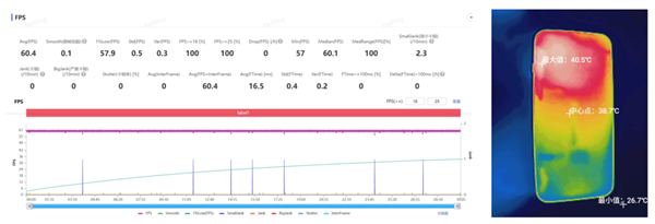 根据 Perfdog 记录的数据,Find X9 Pro 《 原神 》须弥城跑图平均帧率 60.4 帧,全程稳成一条直线,整机平均功耗4W,半小时跑图结束后机身最高温度 功耗40.5℃,完全没有压力。