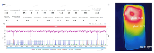 来到压力更大的《 崩铁 》黄金的时刻跑图环节, Find X9 Pro 平均帧率也能来到 58.2 帧,全程没有太大的波动,但整机功耗更高, 8.2W ,半小时跑图结束后机身最高温度 53.5℃ ,有点烫手。。。