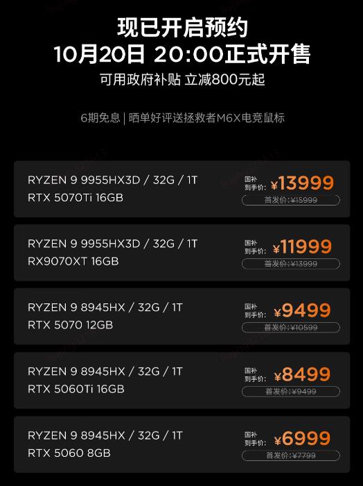 若追求更高性能,用户可在R9-8945HX处理器基础上选择搭载RTX 5060 Ti或RTX 5070的版本,京东补贴到手价分别为8499元与9499元;若需极致性能体验,搭载R9-9955HX3D处理器与RX9070XT显卡的顶配型号,则以11999元的补贴到手价,充分满足高端玩家对性能的极致追求。