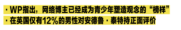 2025年Statista针对安德鲁·泰特的一项调查显示,78%的男性听说过他,但仅有12%的男性对他持正面评价,这一比例较2024年下降了18%。