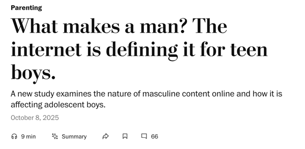 “…研究指出,网络网红已经成为青少年男孩获取指导和情感支持的重要来源——这是一个显著的世代转变,因为以往的几代人主要依赖亲属、社区成员或传统媒体来寻找男性榜样…”