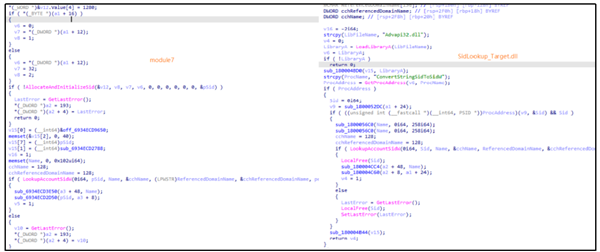 图 module7(左)与SidLookup_Target.dll(右)代码同源性对比