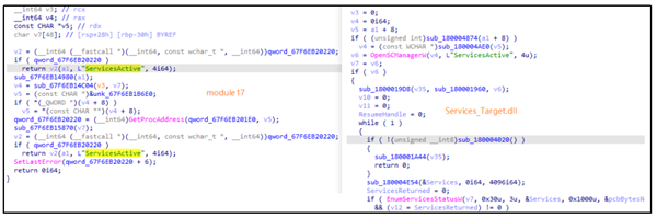 图 module17(左)与Services_Target.dll(右)代码同源性对比