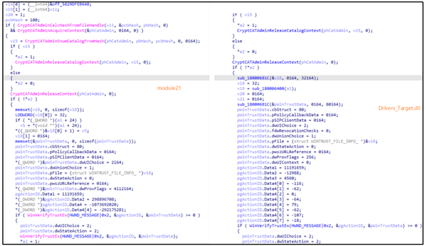 图 module21(左)与Drivers_Target.dll(右)代码同源性对比