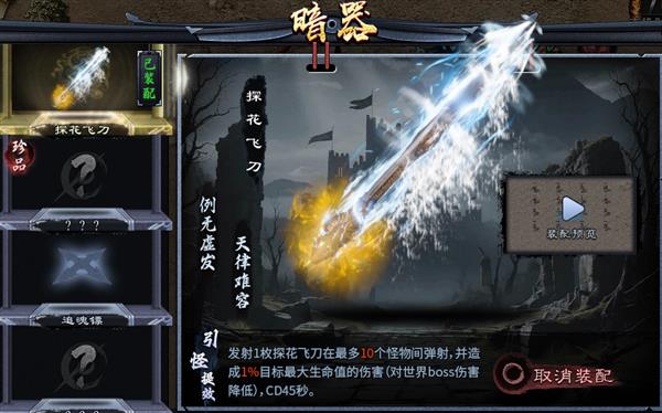 在武侠小说里,很多高手都会使用暗器,游戏中也单独加入了一个暗器系统,需要用任务和刷怪获取的特殊道具去解锁不同的暗器。不过比小说中更强悍的是,这个暗器不需要瞄准甚至不需要手动发射,冷却CD之后就会自动射出,对敌人造成大量伤害,比较适合对战中小boss,如果要打世界boss的话,暗器的伤害会相应降低。