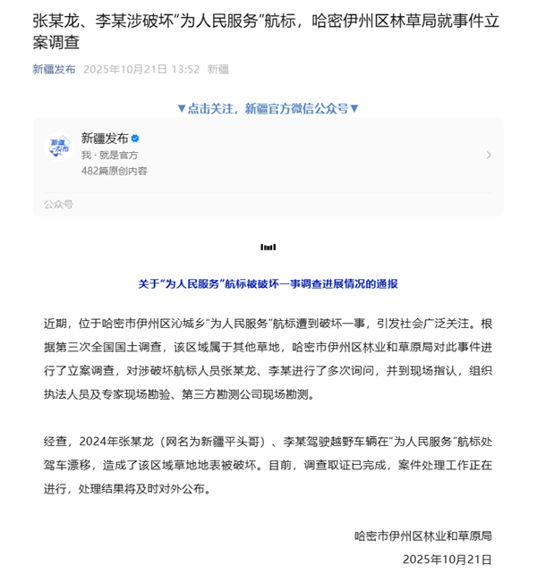 据新疆发布公众号通报,近期,位于哈密市伊州区沁城乡“为人民服务”航标遭到破坏一事,引发社会广泛关注。