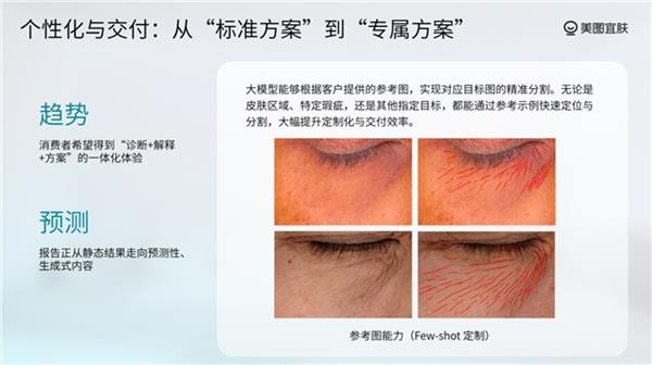 针对美业测肤领域定制化能力不足痛点,美图宜肤推出美业AI大模型,通过三大核心能力将测肤从“一次性服务”转化为可沉淀的“长期资产”,为品牌提供精准高效的个性化交付支持。