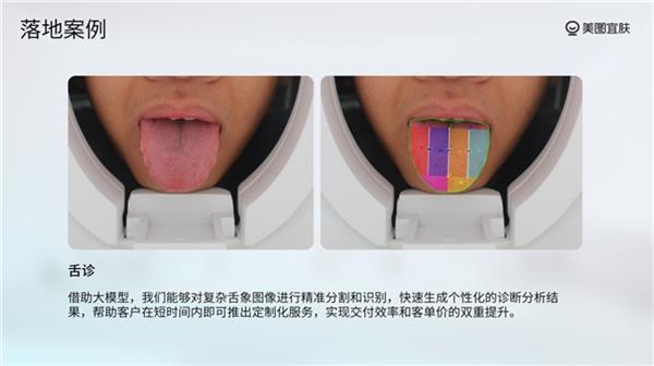 在痘坑检测场景,通过大模型驱动小模型训练,精准识别痘坑区域,结合报告深度解读,把检测结果转化为顾问可讲、用户能懂的差异化价值,显著提升客单价;在舌诊分割场景,能够对复杂舌象图像进行精准分割和识别,快速生成个性化的诊断分析结果,帮助客户在短时间内即可推出定制化服务,实现交付效率和客单价的双重提升。