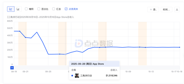 根据点点数据统计,10月上旬游戏iOS端收入出现明显回落,单日流水从约459万美元的高点降至最低点151万美元,跌幅一度超过六成。