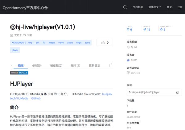 登录“OpenHarmony”官网,点击“开发者”—>“OpenHarmony三方库中心仓”,搜索“hj-live/hjplayer”即可获取相关资源。