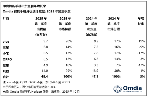 电脑知识网10月22日消息,咨询机构Omdia最新数据显示,2025年第三季度印度智能手机市场同比增长3%,出货量达4840万台。