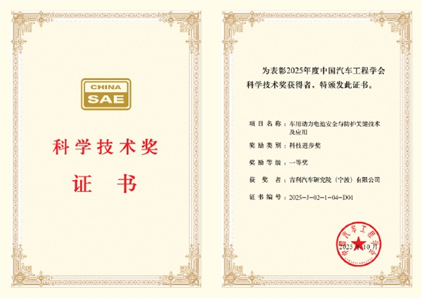电脑知识网10月22日消息,据媒体报道,近日,吉利汽车“车用动力电池安全与防护关键技术及应用”项目,荣获2025年度“中国汽车工程学会科学技术奖”科技进步奖一等奖。