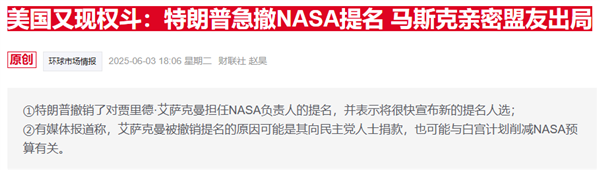 自特朗普重回白宫以来,马斯克一直推动其亲密盟友贾里德·艾萨克曼(Jared Isaacman)担任NASA局长。但今年6月,马斯克离开“政府效率部”后,特朗普撤销了对艾萨克曼的提名。