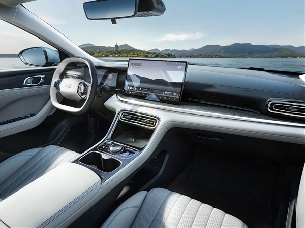车内采用双拼色设计,所触皆软包,浅色打孔皮质座椅搭配哑光银饰条,并提供14.6英寸悬浮式中控屏与10.2英寸全液晶仪表盘,配备Flyme Auto车机,整体看上去极具高档质感。