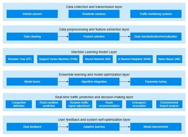 然后,使用集成学习的方式,将不同的机器学习算法组合以提高预测的准确性。具体来说,决策树模型用于快速分类交通流量数据,支持向量机则在更复杂的数据分类问题上表现优异,神经网络能够处理高维、非线性特征数据。K最近邻算法用于在相似条件下查找最优交通策略,而朴素贝叶斯模型在数据稀疏时具有良好的稳定性。通过这些模型的协作和集成,系统可以在不同场景下选择最适合的算法来优化交通管理策略。