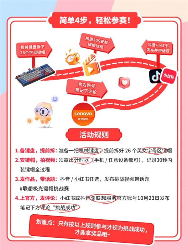 想试试手速能不能上热榜?或者单纯想为自己的键盘找点存在感?别犹豫了,现在就能参与挑战,不止收获点赞,更可能收获一套真正会“发光”的桌搭好物。更多活动详情及参与方式,请关注小红书/抖音【联想服务】官方账号10月23日发布的挑战赛内容