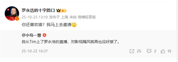 随后,罗永浩转发表示:“你还喜欢谁?我马上去邀请”。