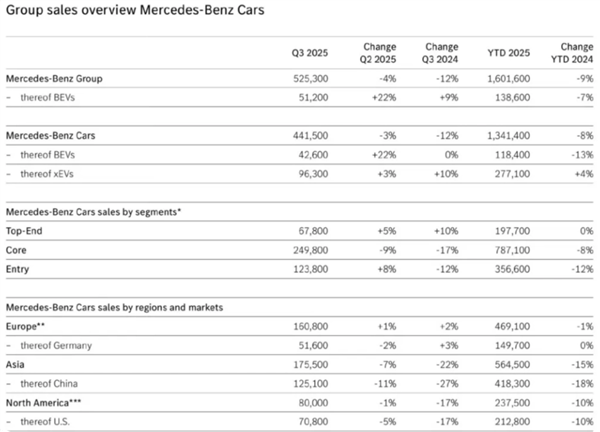 奔驰选择裁员的背后,是集团销量表现不振的残酷现实。官方数据显示,奔驰集团第三季度全球销量为52.53万辆,同比、环比分别下滑12%、4%;其前三季度累计销量为160.16万辆,同比减少9%。