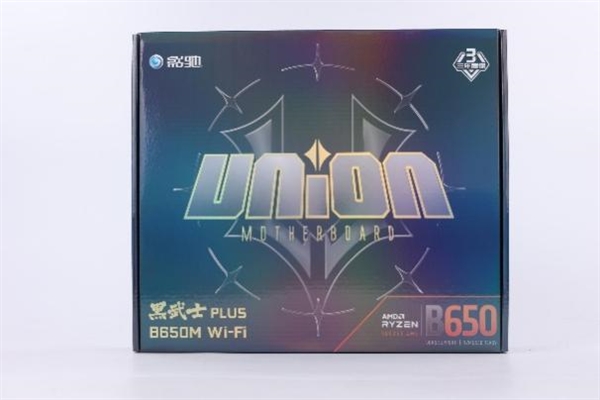 影驰联盟 B650M Wi-Fi 黑武士 PLUS主板的外盒设计延续家族风格,以纯黑色为底色,正面视觉焦点集中在“union”大写标志与“B650M Wi-Fi 黑武士 PLUS”产品名称上。右下角标注主板B650芯片组、兼容CPU范围,右上角则保留了“三年质保”标志,为用户售后保障。