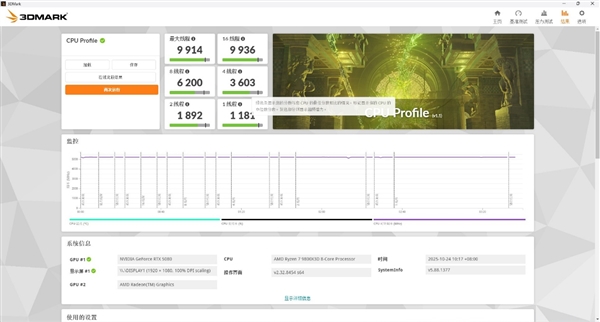 3DMARK,CPU Profile性能测试如上,最大线程分数为9914。