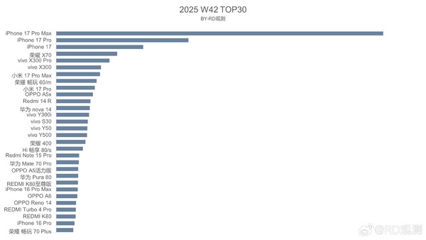 根据数码博主曝光的最新销量数据,2025年第42周手机销量TOP30榜单呈现出诸多特点。