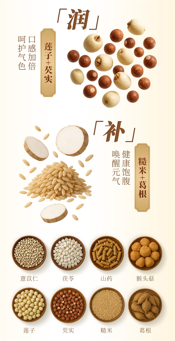 8味上品食材+4重食力呵护+益生元添加量≥13%,0添加蔗糖、香精。