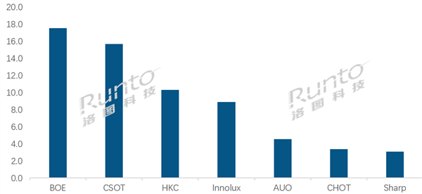 台系面板厂Innolux(群创)和AUO(友达)合并市占率为21.2%,同环比分别下降了0.5和2.6个百分点。