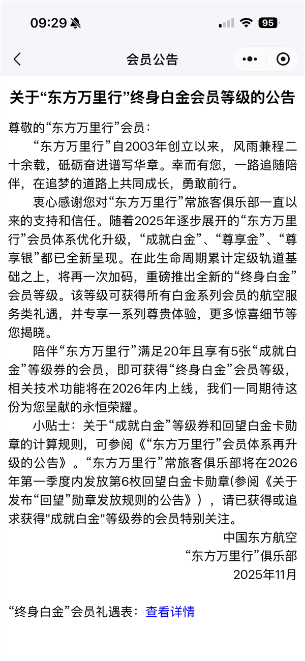 据公告,“终身白金”会员的获取门槛为“陪伴东航满20年且享有5张‘成就白金’等级券”,相关技术功能将于2026年内上线。