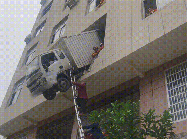巨大的冲击力让货车冲破墙体,车头与车身前半段悬在室外,距离地面约15米,下方还存在负二楼,一旦车辆坠落,后果不堪设想。