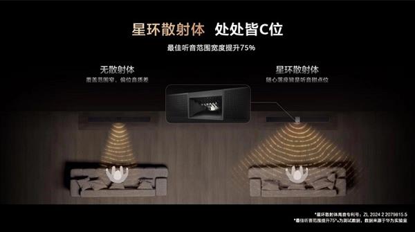 在水平方向,多声道音箱内采用的星环散射体专利设计,让声音形成了向外扩散的均匀声场,从而扩大正面听音的“甜点区”,无论用户坐在哪,都是听音C位;在垂直方向,多声道音箱与环绕音箱则应用了双极子阵列扬声器专利技术,仿佛在天花板安装了天空音音箱,大大提升声波指向性,增强了声场的环绕感。华为悦彰家庭影院在水平与垂直方向的声音均实现精准定位,为用户带来360°环绕式影院声场体验。