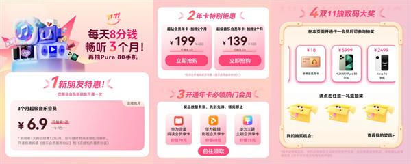想要发现好音乐?华为音乐丰富的主题歌单和个性化推荐,从通勤必备到运动能量,从专注学习到休闲放松,总有一款契合你当下的心境。双11期间,华为音乐推出超值福利:超钻会员年卡加赠2个月,到手仅需199元;升级鸿蒙5及以上系统的用户开通年卡,还可领取华为阅读、视频、主题等联合会员季卡。所有会员皆可参与全年仅此一次的年卡大秒杀,并有机会抽中Pura 80手机、HUAWEI Sound X4音箱等惊喜好礼。新朋友还有专享福利,6.9元即可畅听3个月,平均每天低至8分钱,轻松开启高品质音乐旅程。