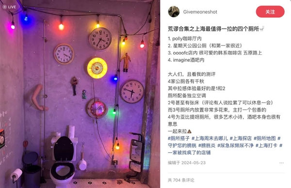 除了为了人们解决基本需求,还有一些人会分享进阶的如厕体验,我愿将这批博主称为体验派,他们注重在地化体验,专门挑选富有艺术气息的厕所拉一次“Holy shit”。