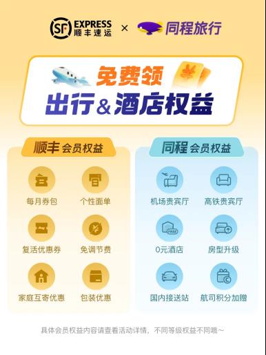 此次合作后,顺丰会员不仅可享受每月券包、个性面单、复活优惠券、免调节费、家庭互寄优惠及包装优惠等收寄特权,还可享受同程旅行会员专属权益,包括机场及高铁贵宾厅、0元酒店、房型升级、国内接送站、航司积分加赠等旅行特权。
