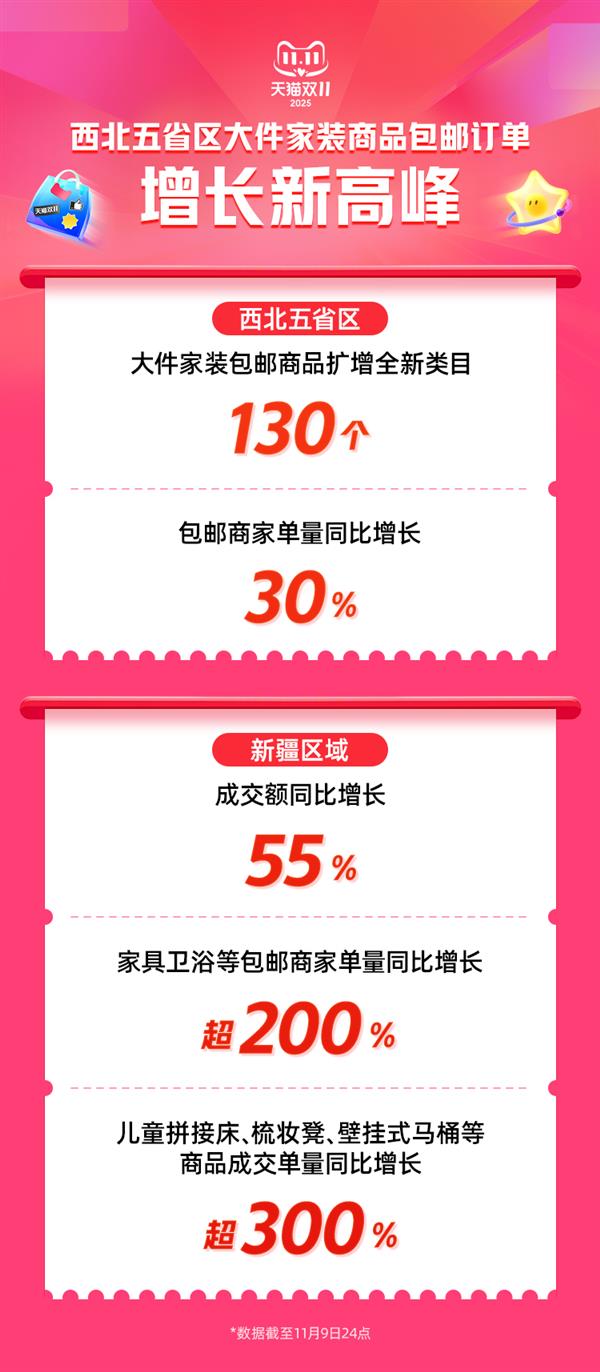 平台数据显示,截至11月9日24时,甘青宁内蒙新疆5个省区包邮商家单量同比增长 30%。其中,新疆区域成交额同比增长55%,家具卫浴等包邮商家订单量同比增长超200%,63个商品类目成交单量翻倍,儿童拼接床、梳妆凳、壁挂式马桶等商品成交单量同比增长300%以上。